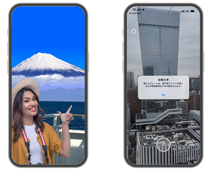 駿河湾フェリー周辺でのみ、富士山フレームでの撮影は可能です。県外などの対象範囲外にいる際に撮影機能を起動すると、メッセージが表示され撮影画面へと遷移しません。